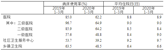 2020年1-3月,医院病床使用率为62.2%,同比下降22.8个百分点;社区卫生服务中心为39.2%,同比下降14.5个百分点;乡镇卫生院为63.5%,同比下降15.0个百分点。三级医院平均住院日为9.0日,与上年持平,二级医院平均住院日为8.4日,比上年减少0.1日。