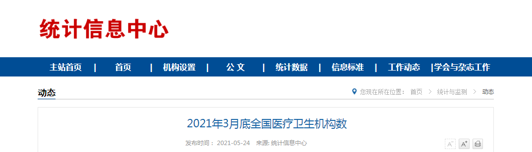 国家卫健委官网在5月24日,公布了2021年3月底全国医疗卫生机构数量。