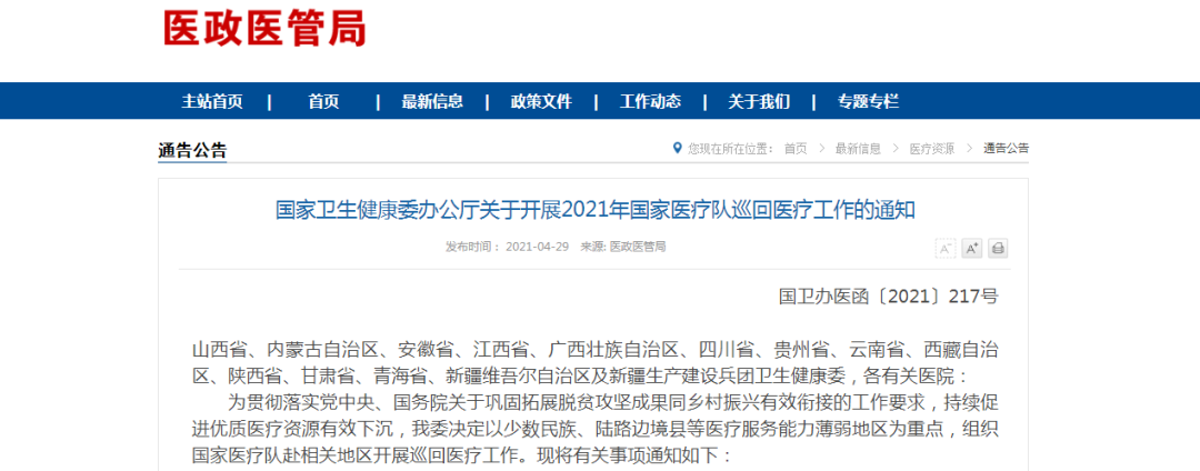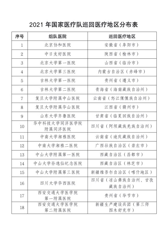 持续促进优质医疗资源有效下沉,国家医疗队再出发,新一轮巡回医疗工作开启!近日,国家卫生健康委办公厅印发《关于开展2021年国家医疗队巡回医疗工作的通知》(以下简称《通知》)。《通知》旨在巩固拓展脱贫攻坚成果,同乡村振兴有效衔接,持续促进优质医疗资源有效下沉。《通知》称,以少数民族、陆路边境县等医疗服务能力薄弱地区为重点,组织国家医疗队赴相关地区开展巡回医疗工作。