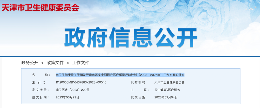 7月4日,天津市卫生健康委印发《天津市落实全面提升医疗质量行动计划(2023—2025年)工作方案》(以下简称天津《方案》)。