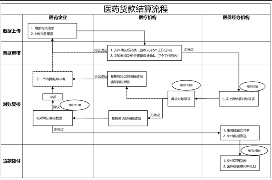 医保经办机构根据医保招采系统生成的医药货款结算支付单,每月底前通过医保基金支出户及时向医药企业支付医药货款,并从对应医疗机构下月的医保结算费用中抵扣。遇节假日或不可抗因素需调整结算时间时另行通知。