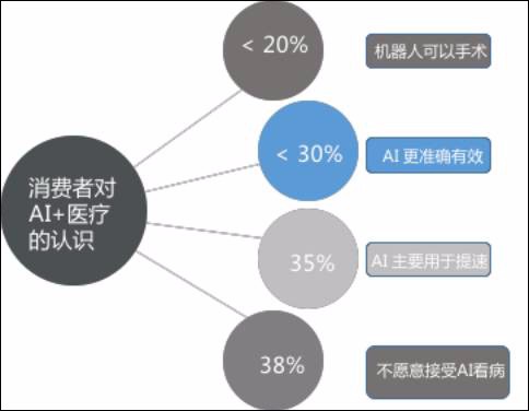 任何一项产生变革或颠覆性的新技术,其产生、发展和应用必然要经历一个漫长的被市场认可的过程。目前,消费者对人工智能+医疗仍处于远观和存疑的态度。普华永道2017年就人工智能+医疗的应用意愿进行了调查,有近4成的消费者不愿意接受人工智能来看病,即使对人工智能+医疗相对宽容的用户,也仅愿意用人工智能进行常规指数监测、心率监测、健身监测等非治疗环节。