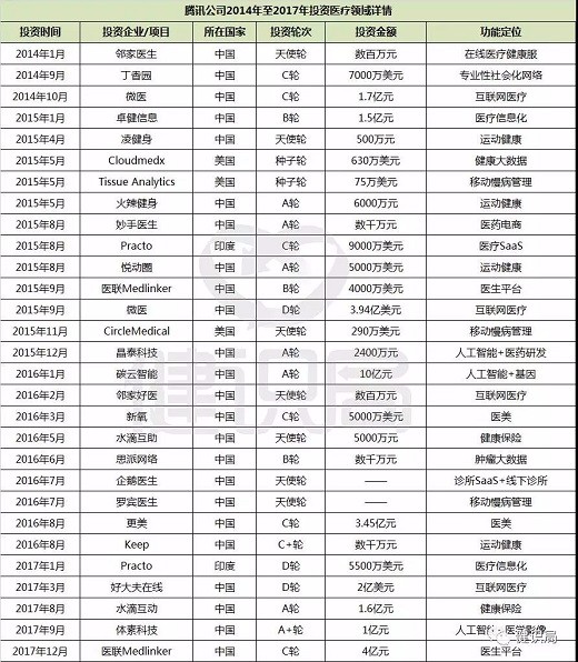 2014-2017三年间,腾讯先后投资了微医、丁香园、卓健科技 、医联、好大夫在线等13家有望成为互联网医疗细分领域(患者服务、医生服务、医院服务)独角兽的新兴企业。
