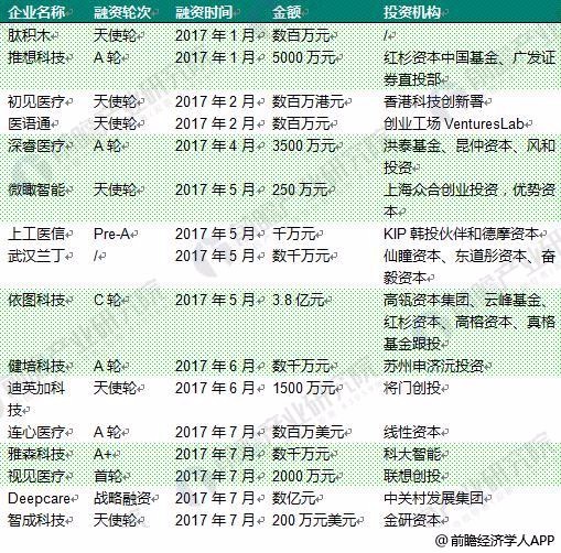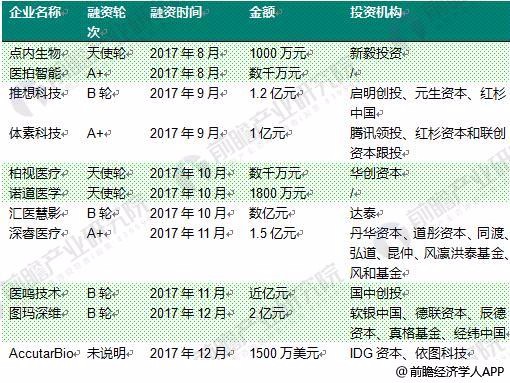 图表9:2017年我国医疗人工智能企业融资情况汇总(一)