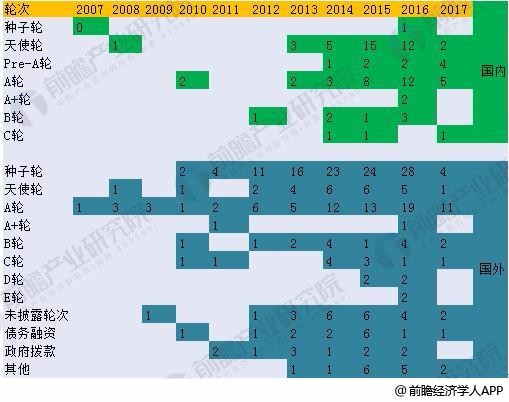 图表2: 2007-2017年国内外投融资轮次及时间分布热力图(单位:个)