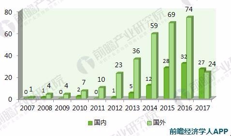 图表1: 2007-2017年国内外医疗人工智能融资数量(单位:个)
