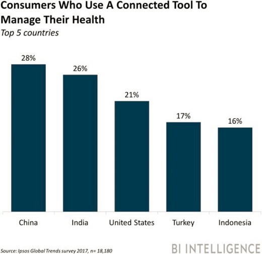 在数字健康创新方面,美国、英国等成熟市场毫无疑问走在最前列。但如印度、印度尼西亚、中国等新兴市场有望在未来一段时间赶上甚至超越。原因如下: