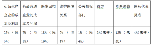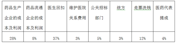 在市场经济的今天,竞争不可避免,包括药品在内的商品供应的规律是:谁在利益链条中控制权大,谁的利益就大,医生的处方决定着药品的销量,所以医生所占的比例最大,药品生产企业、药品流通企业和医药代表由于市场竞争,只能获得平均行业利润,不可能有暴利,由于政府招标、零差率、不得二次议价的政策让药品生产经营企业不得不给予招标部门、医院管理者、统方部门、医药代表一定比例的现金费用,为了洗出这些现金还必须花十多个点的洗钱成本。