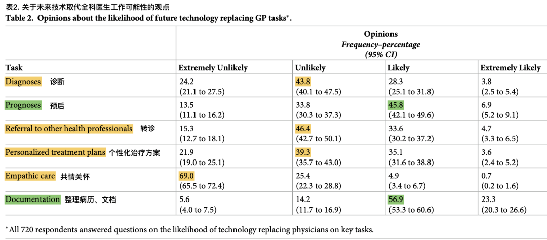 与之相反,判断预后(45.8%)和整理病历等归档工作(56.9%)被视为可以被替代的,支持后者的人甚至超过了一半。