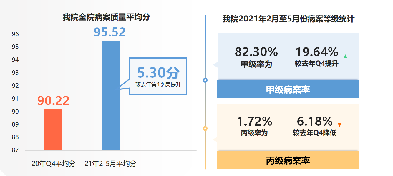 2021年2月份,我们医院正式上线人工智能病案质控系统。上线时,我们对病历书写评分重新做了一个调整:对去年第四季度的出院病历重新打分,平均分90.22分;今年2月到5月出院病历的平均分为95.52分,提高了5.3分。甲级率提升了将近20%,丙级率也下降了6.18%。效果很显著。