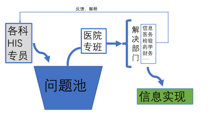 每天在工作中实时发生的问题,由各科的“HIS专员”做初步判断后,放到“问题池”,由专班群体做研判,分解给各管理部门,做了决策后交信息技术人员实现。“HIS专员”群将触角延伸到每一个科室,这样的网络,既保证了高效集中,又疏而不漏,做到了“最精简的全覆盖”。在实际运行中起到了很好的效果。